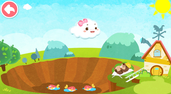2、游戏开始我们可以看见,池塘内的小鱼都因为没有水不能游泳了,我们这时候就需要点击小云朵安吉下雨,为小池塘灌满水吧