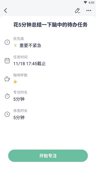 具体操作,点击右上的“…”或者“铅笔”图标进行待办任务的编辑,操作完成后点击保存即可,之后在待办清单中开始专注。