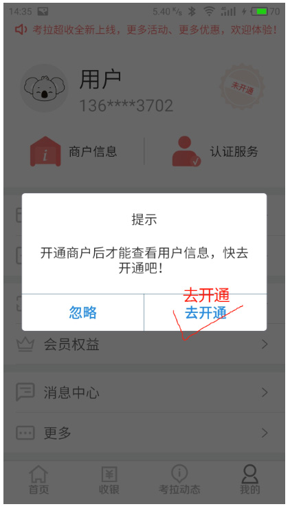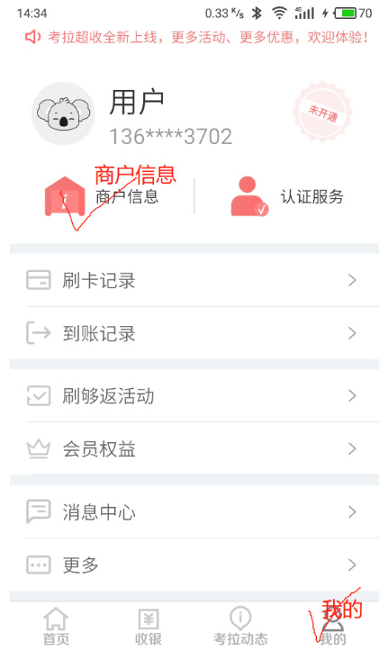 打开考拉超收APP注册账户(已使用过拉卡拉收款宝的用户请用原注册手机号登录)点击已有账号登录