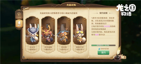 首次签约只要30蓝钻,每完成16次试炼可免费签约1次。签约试炼助手小队,就可以获得它们24小时内随叫随到的协助!