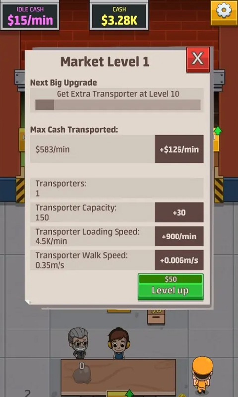 5、升级市场,增加运输车,以及最大运输量,提高运输车的速度,并增加运输工人。