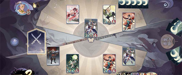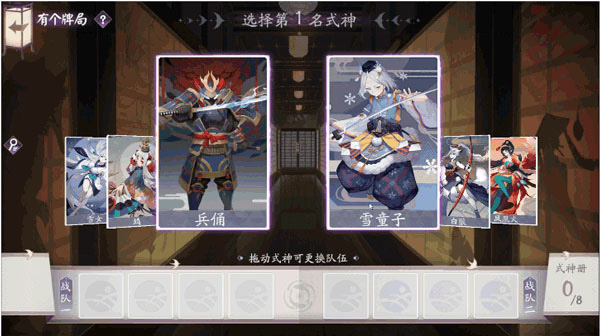 客人将经过八轮式神选择,组建两个队伍出战;每轮选择时,客人可以从两个式神中选择一个,而排在被选择式神后的两个式神,将成为下一轮的待选式神;每次选择式神后,将随机生成该式神8张卡牌组成其牌组。