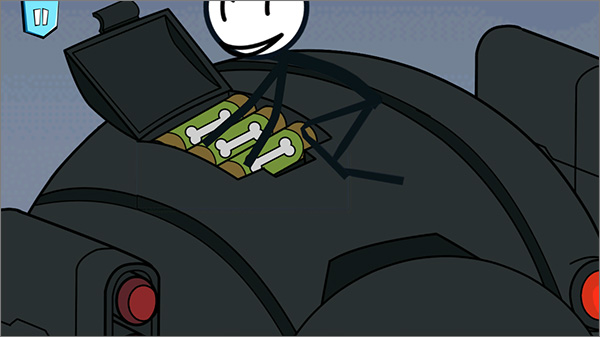 4、若玩家没有完成五角星会被关进监狱,火柴人在监狱中越狱进入机器人设备室,玩家可选择打包机器人或选择怼人鸭;
