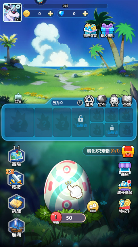 1、进入游戏首页,它会送玩家50个宠物蛋,点击解开孵化;