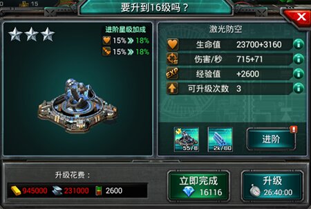 防御塔进阶功能开启,通过消耗防御合金和相应的防御塔碎片进阶防御塔星级,百分比提升防御塔攻血。