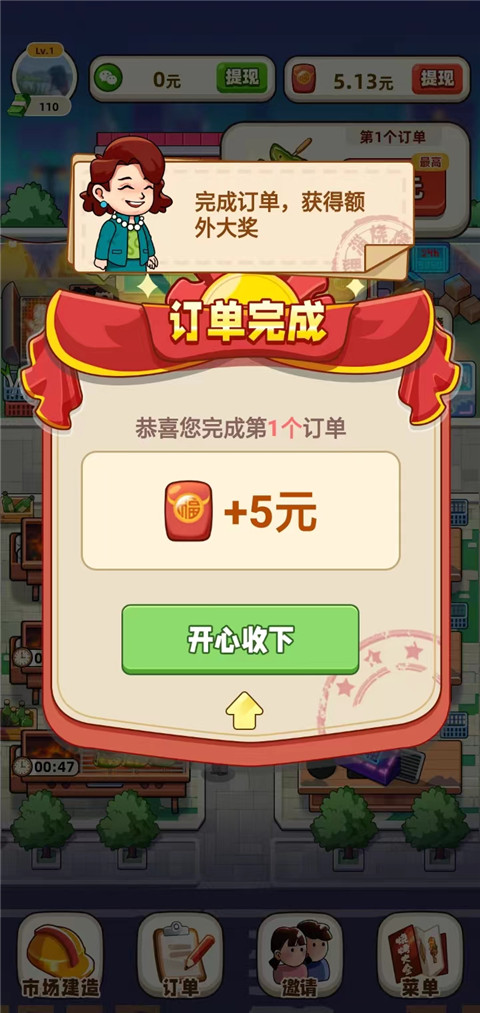 游戏里还有各种任务,完成订单可以解锁新食材和技术,提升自己的能力。玩得越久,提现的比例也越高,一直做任务还能拿到大奖。新手的话,下载安装后用微信登录就能开始赚钱了,操作挺简单的。