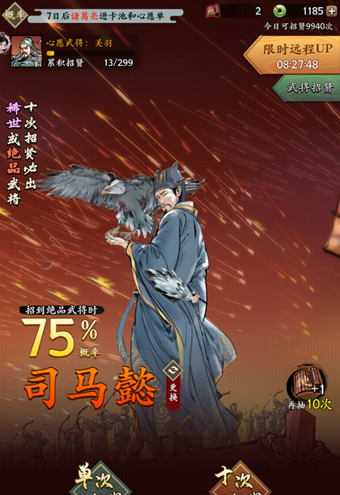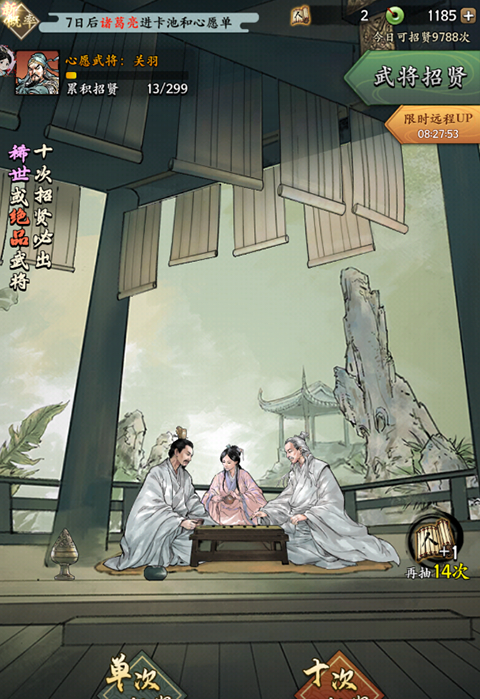 而在你们将这个设定为心愿的武将抽到之后,是可以将其换一个再进行抽取的。此处想更快获取高品质的武将,那么就需要进行十连,此处是有保底的,最多抽取五十次便会出绝品的武将,如果你运气好,那么就会更快获取。
