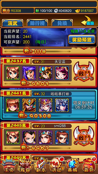 3、挑战比自己排名高的,胜利获得20点声望,失败获得10点。挑战比自己排名低的胜利获得10点,失败获得5点。