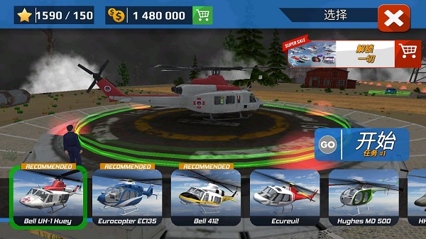5、在开始任务之前,你可以挑选自己的直升机,在这里有数十种不同风格的直升机可供玩家选择,选择完成后,点击“GO 开始”执行任务!