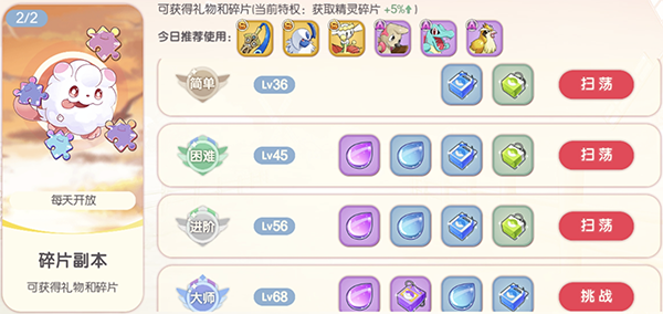 伴随着等级提升,将开放不同等级的挑战,奖励也会越来越好。礼物副本的敌人分别会有免疫物攻和免疫特攻的特殊潜能存在,各位训练家要做好准备哦!碎片副本不仅产出s级小精灵碎片,还有紫色和蓝色潜能石,属于每日必打的玩法。