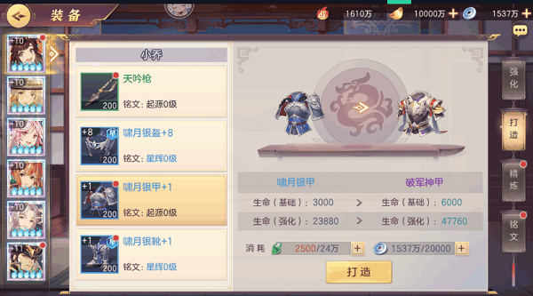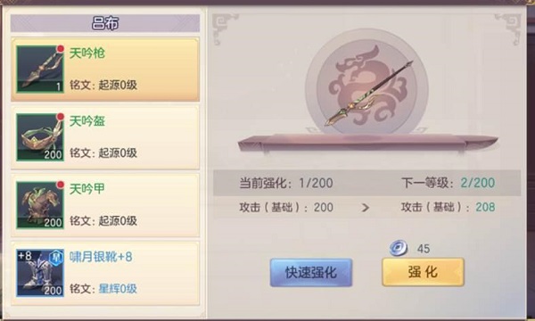 总结:装备的升级等都需要在黄天秘境或者商店中才能获得兵玉,基本上想要提升6个武将的装备达到很高的等级的话短时间是很难完成的,因此个人建议装备只需要给主C打造后进行升级,等到后期资源充沛后,在给其他武将打造装备。由于该系统获取资源难度和加的战力实在是不成正比,所以不需要在装备上下太大功夫,玩家有资源再去打造下装备就行了。如果大家需要提升自己的装备的话还是要好好光顾一下黄天秘境,只有通过更多的关才能获得更多的资源。