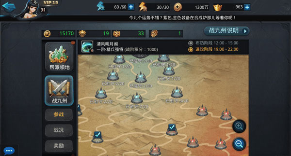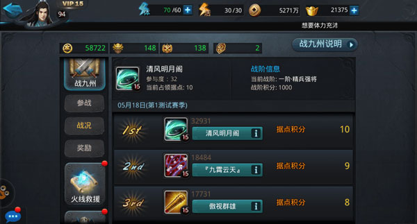 战九州每周都是3个帮派团队的博弈,所有的玩法都围绕着积分来开展,这个积分有3个维度,大家务必清楚: