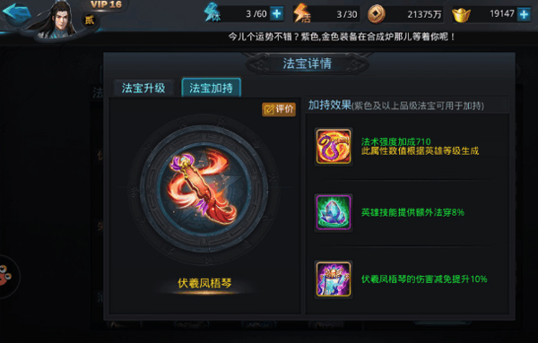 3、法宝方面,推荐琴,当前琴是非常克制罗汉的一个法宝,范围外的40%减速,为阵容提供的保护真心赞。