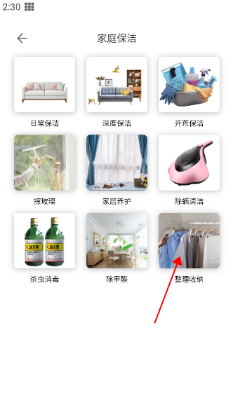 2、家庭保洁也有很多种类,比如我需要整理收纳,那就点击相应选项进入。