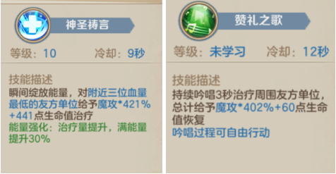 其次,是圣言师职业中的回血技能:神圣祷言、赞礼之歌。如下图所示。