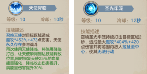 天使降临:审判路线核心技能,天使将拥有不错的魔攻伤害,并且天使不怕死,可永久存在在战场,可以极好的做出消耗的作用。圣光牢笼:圣言师职业唯一硬控技能,无论是何种路线,必点技能,配合控制类宠物,有着极佳的控制效果,在1V1的PK中,能发挥意想不到的效果。