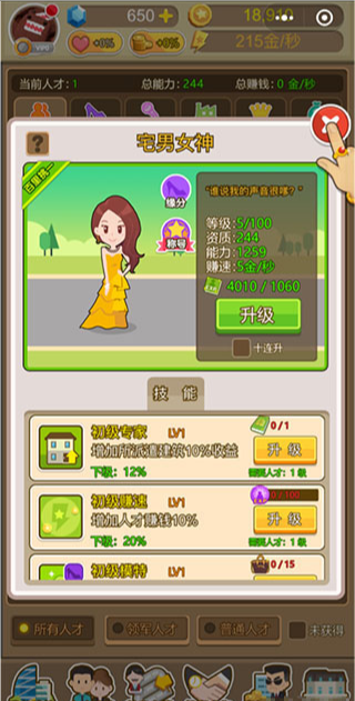 7、有钱了去干什么呢?雇佣人才啊!模特,明星,企业家,贵族,投资家,随着等级的提高,都可以帮助玩家提升赚钱的速度,等于这些人才在为玩家赚钱,所以积累财富来多雇佣人才吧!