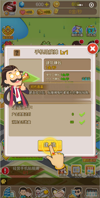 3、按照系统提示点击建造就可以获得赚钱建筑,选择建造手机贴膜摊,建筑的每秒收入意味着在单位时间内给玩家增加的财富,给建筑升级是非常重要的,建筑的等级越高,每秒赚的钱就会越多,所以要记得经常给建筑升级哦!