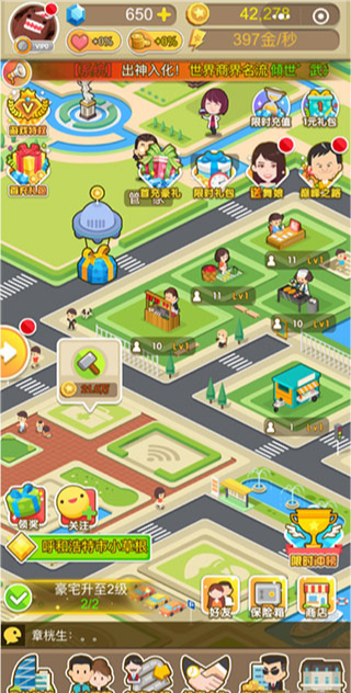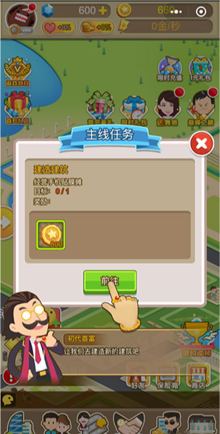 2、主线任务不仅给玩家丰厚奖励,还会提示玩家建造或升级不同的建筑。一开始所有玩家都会从最基本的手机贴膜摊做起,日后会逐步解锁更多高级建筑,高级建筑可快速增加赚速哦!