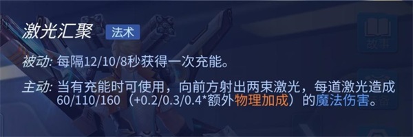 大招是激光汇聚,向前方射出两条激光,每道激光都可以造成伤害,而且施法距离是12米,超远的距离让敌方无处可藏。但是要注意自己攒层数,本身被动可以随时间攒,三技能也可以攒