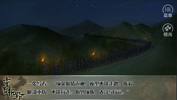 重走长征路是根据长征历史改编而来的一款RPG文字冒险类手游,游戏以长征第五次反围剿失利为背景,玩家在这里将扮演要一名红军指挥官,这期间你将要带领所在部队踏上两万五千里的长征之路,在长征的路途中我们会遇到各种各样的突发状况,如遇到敌军或者劫匪,又或者是过草地,翻雪山,总之我们需要征服各种恶劣的自然环境,带领红军队伍走到最后。目前重走长征路游戏内共有50多个结局等你来探索,玩家所做的每一个决定,都将影响故事最后的结局,感兴趣的小伙伴们欢迎在本站下载体验。