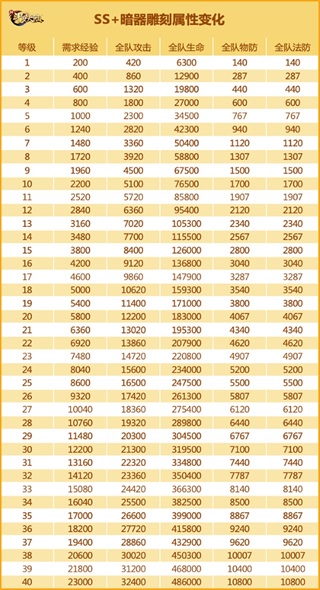 升星不同,SS+暗器属性也有较大幅度提升,下图表可见升星对属性的加成影响: