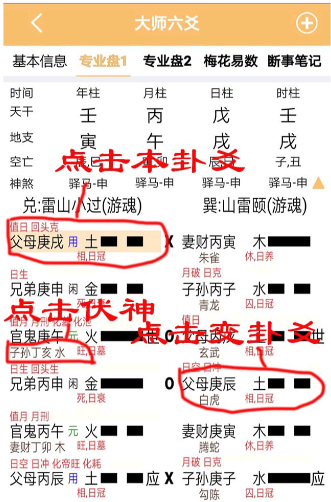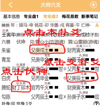 (1)专业盘1点击本卦爻,伏神,变卦爻查看提示