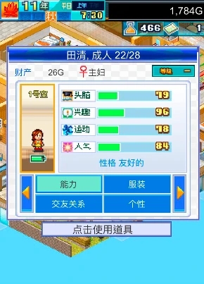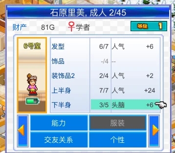 ②头脑影响就职、考试;兴趣影响称号的挑战;运动影响移动速度;人气影响恋爱能力