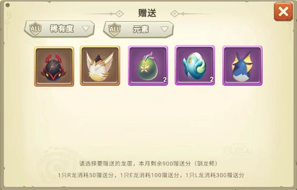 提高好友亲密度,可以提升亲密度等级。亲密度2级以上可以互相赠送龙蛋,亲密度等级越高,好友间每个月可赠送的龙蛋分值越高。玩家每月获赠上限分数为500。R龙价值30分,E龙价值100分,L龙价值300分。