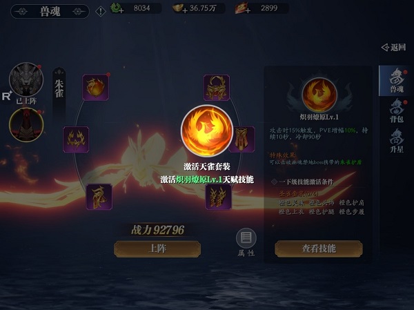 2、需要注意的是,穿戴一套紫色以上装备时,才可以解锁兽魂专属技能,并且穿戴更高品质星级的套装,还可以激活更高等级的技能和效果哦。激活技能以后,御灵师还可以选择上阵兽魂,最多同时可以上阵3个兽魂,由此还能带来更多战力加持与技能效果!