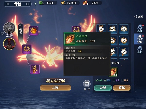 3、不仅可以装备兽魂,通过兽魂精魄还可以进一步强化装备,提供额外属性。即使后续更换装备,强化的等级也会保留下来哟~低品质的装备也可以直接分解为强化用的兽魂精魄,相应的,更高品质、星级的装备,其分解出的兽魂精魄也更多。