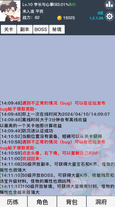 2、点击关卡,选择适合自己的关卡,点击挂机可以获得大量升级经验。