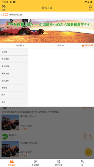 1、进入app可以看到下方有四个主要功能版块,农机调度、作业监控、监控记录和我的版块