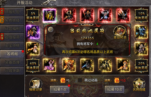 5. 每招募1次武将可获得1点招募积分,积分可用于名将商城中兑换稀有道具
