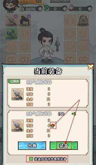 玩家在开箱的时候会获得相同的装备,这些装备的效果不同,有的品质更高,需要玩家进行切换。玩家可以查看装备对比,如果是绿色箭头就可以直接切换装备,然后将下方的“装备后自动出售原装备”勾上,这样低级装备就会自动出售啦!