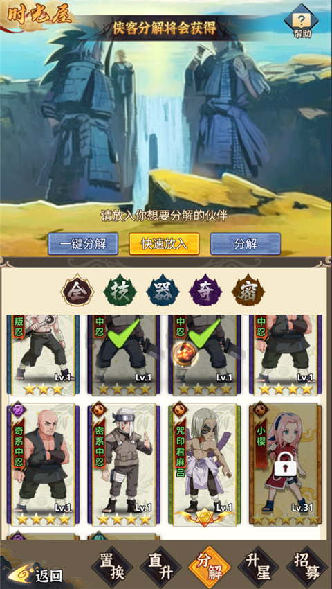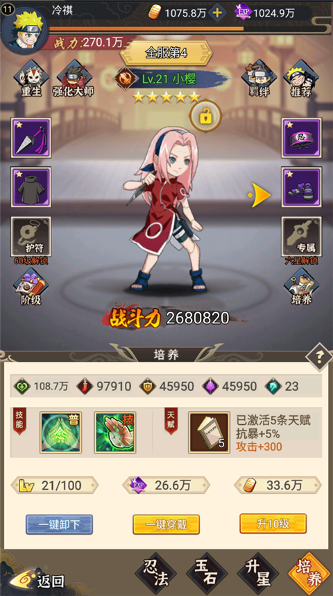游戏中还原了鸣人、自来也、大蛇丸、小樱、宇智波佐助、旗木卡卡西、纲手、雏田等经典人物,玩家可以进行招募培养,且每一位角色拥有着各不相同的技能,通过合理上阵可以搭配出不同的组合效果。