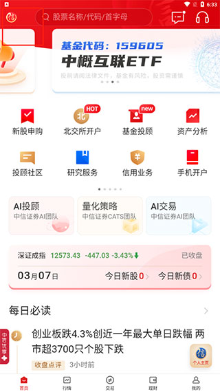中信证券信e投APP手机版是一款股票开户、基金理财综合交易软件。它是中信证券公司旗下唯一的手机客户端产品,全面改版更加出色。全方位支持各种证券业务,页面设计时尚流畅,更多自主人性化功能。软件具有首页、行情、交易、市场、我等五大功能模块。信e投是中信证券为投资者定制的投资利器。通过对金融科技的专注以及用户体验的追求,坚持以投资者利益为中心的理念,全方位实现各种证券业务,力争成为更多投资者信赖的券商App。