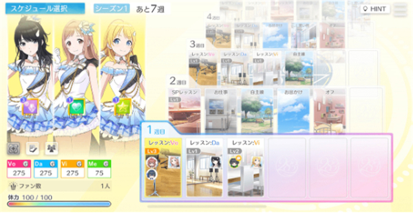 日程上有可以获得制作卡片的课程,也有可以提高状态的自主训练等各种各样的角色的日程。