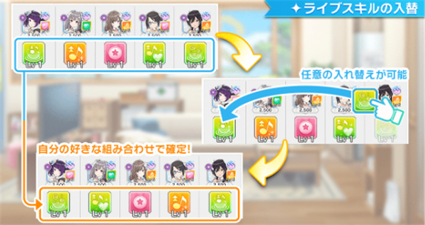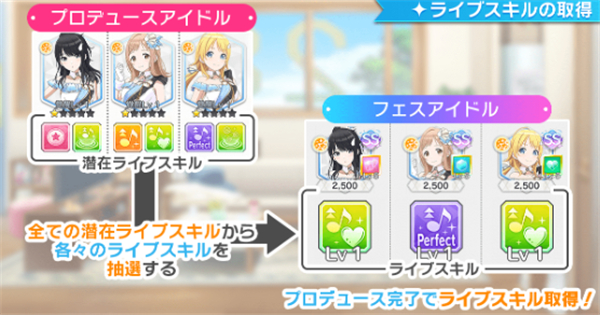 偶像可以取得的现场技能由制片人偶像拥有“潜在现场技能”中被抽选。