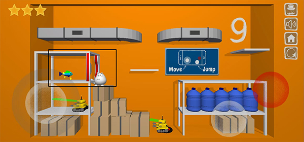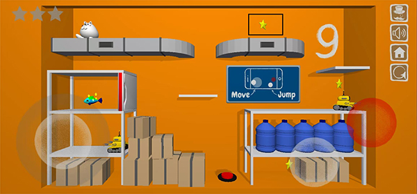 6、在机器人踩住开关的时候,跳进左边门里拿到小鱼即可过关。