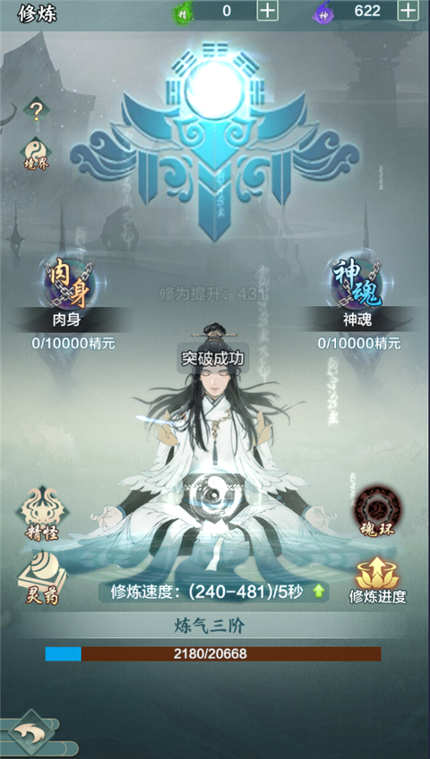 3、在洞府中点击修炼可以看见角色的修炼进度,当修炼满后可以突破