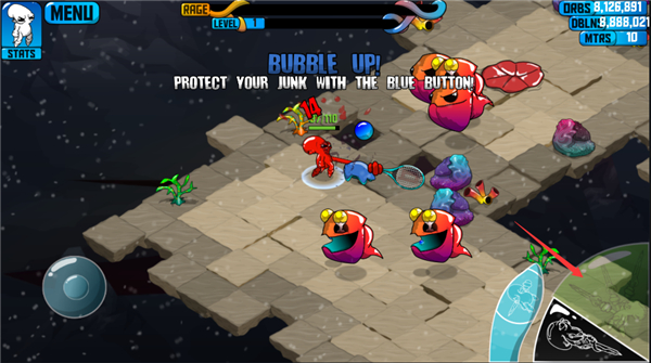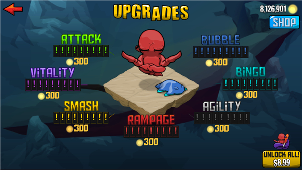 狂暴魔法人中还配备了完整的升级系统和技能系统,玩家可根据自己的喜好对小魔法人Quadropus进行改造,无论是手枪还是魔法棒,章鱼哥使用的都是极其暴力的近身物理攻击。