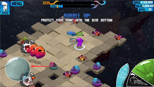 1、在每层地牢当中,都有很多长相更加奇特的怪物(龙虾不像龙虾、螃蟹不像螃蟹的),他们会吐飞弹,会射激光,个个好“流比”。好在我们“章鱼哥”的实力也很强劲。“章鱼哥”的武器很搞,刚登场时是拿着一个球拍武器,后来每下一层地牢还会出现更多奇奇怪怪的武器,棒槌、剪刀、骨棒、镰刀、还有一条形似“金箍棒”的棍状物体......各种离谱的玩意,很逗笑。当传送口亮起,就代表玩家可以进到下一层地牢。不过,建议玩家不要着急进入,先在每一层中强化自己的武器,壮大自己。随着关卡的深入,玩家会遇到各种强大的怪物,如若没有好的道具和装备支撑,很容易被干掉。