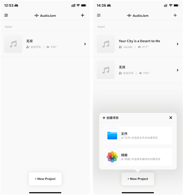 2.、首先就是打开 App 然后点击「+」来创建一个项目,这里需要从 「文件」中导入一个音频文件,支持.mp3、.m4a、.aac、.AIff、.wav 格式的音频文件以及 .mp4、.mov 格式的视频文件。选择导入后,会将其创建为一个工程项目,我们可以看到音频文件已经完成导入,并可以在播放控制页面中看到生成的对应波形。