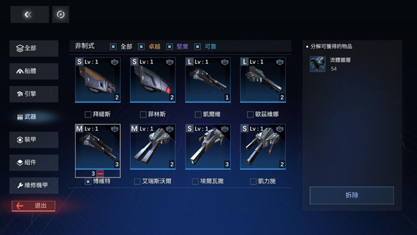 这五大部分除了船体刚刚讲过了,另外四大部分的强化方式都一样,我就挑选武器来说明