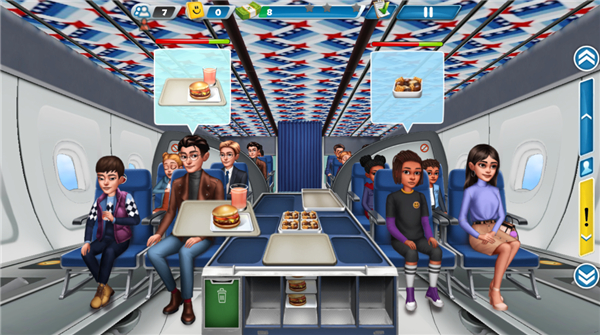 球球旅行记手游整体的内容跟飞机大厨手游没什么区别,点击客机中的顾客需要的美食,返回烹饪区制作好美食放在推车上,前往客机区域送给顾客即可获得金币,金币是非常重要的资源,可以升级设备使制作时间大大减少,等待顾客完成进食还需要将处理卫生。