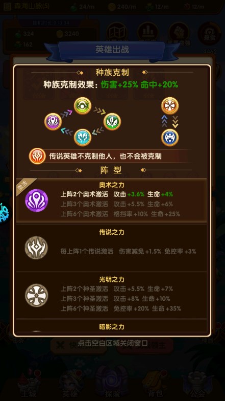 3、六大种族: 设计超过60位英雄,分为神圣、暗影、奥数、亡灵、邪能、自然、传说七大种族。灵活搭配英雄组成强力队伍自由探险。