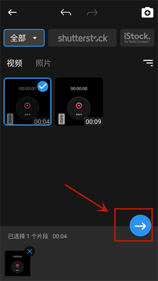 3、创建项目后APP会进入手机的内部存储器,里面列出了所有的视频图片以及文件夹,然后在需要剪辑的视频上面点击一下,点击视频右侧的加号即可添加。如果一个文件夹内视频过多,还可以点击右上角的符号进行排序赛选。选取好了视频点击底部右上角的勾,然后进入编辑界面。