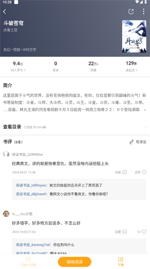 2、点击进入小说页面可以查看用户的评论,或收藏、下载