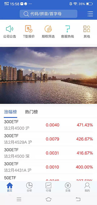 江海期权汇app是由江海证券有限公司所推出的一款集期货、股票行情资讯的手机软件,在其内它不仅提供了实时更新且丰富的资讯,而且还内置了安全快速的交易系统,通过它们可使得用户们不会错过任何可盈利的机会!当然啦,除却资讯和交易系统以外,它的其他功能也是十分的实用、便捷的,比如股票期权T型报价的页面、自选和期权的详情页面、自我筛选的分析页面等等,使用它们可以让你在投资的道路上吸取有利的建议和参考哦。除此之外,江海期权汇还有着一大优势,那便是软件的界面十分的简洁明了,在其界面中只要用户操大致的了解一番即可轻轻松松的找到自己所需的功能,从而可以更快、更高效便捷的进行交易。有需要的用户还在等什么呢,不妨前来本站下载江海证券期权汇手机版体验体验吧。